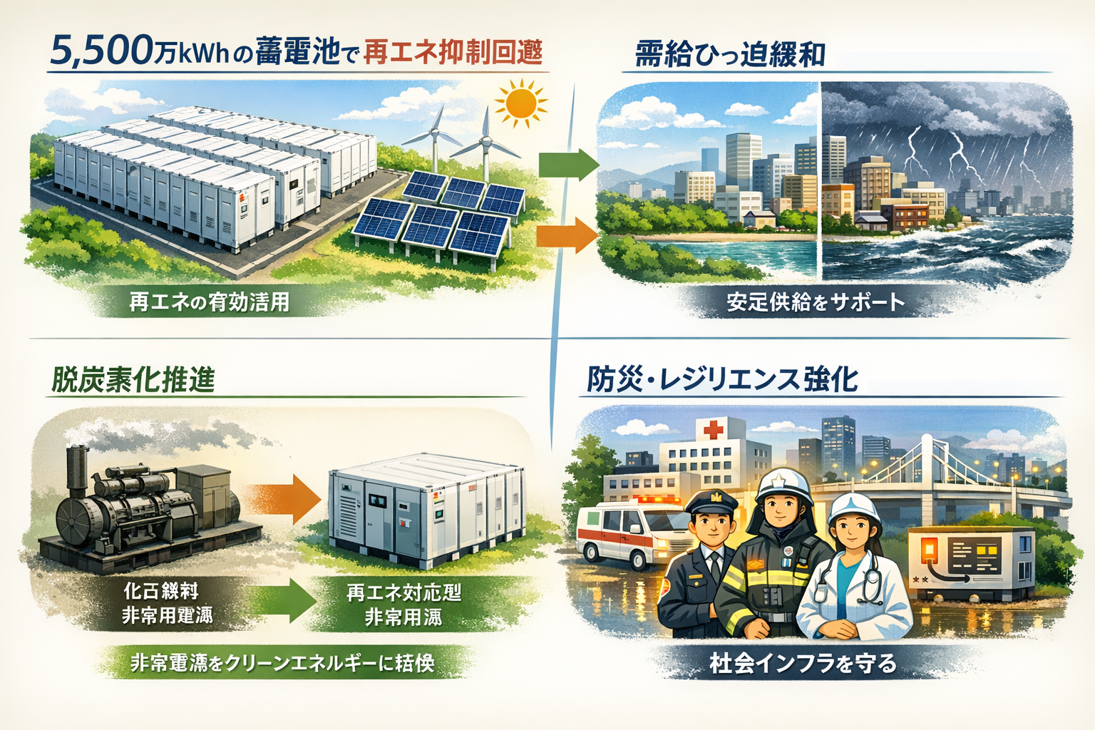 再エネ抑制回避:5,500万kWhの蓄電池常用化により抑制対策に寄与。