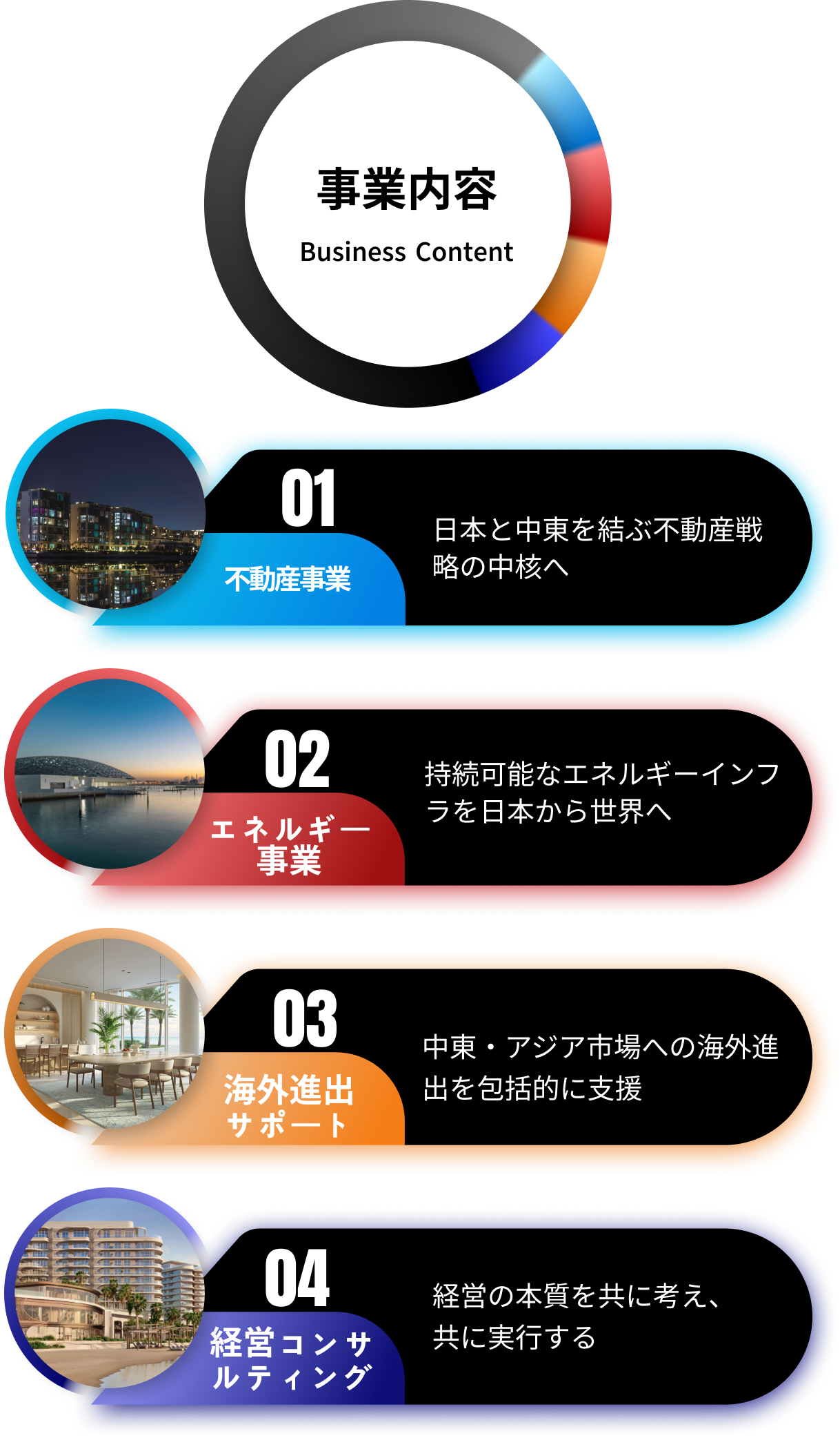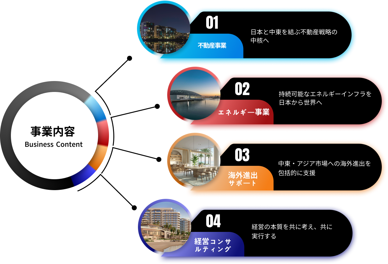 特に中東・アジアへの海外進出支援において強みを持ち、不動産、経営コンサルティ