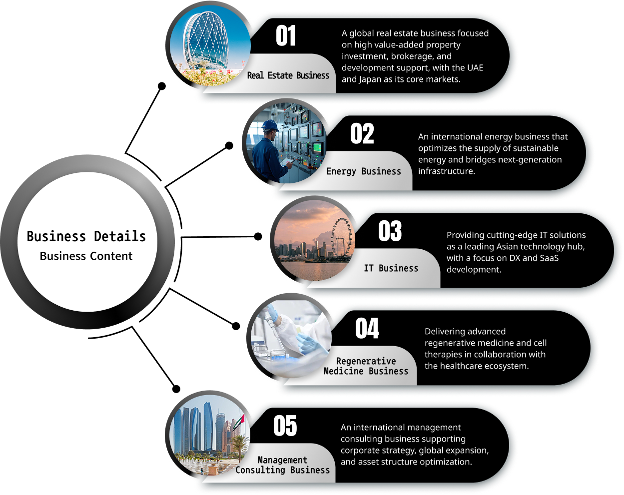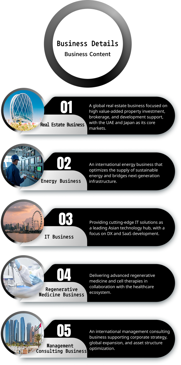 We build a business portfolio focused on sectors with strong global growth potential: real estate (UAE growth), energy (decarbonization), IT (DX), healthcare (regenerative medicine), and consulting (international asset strategy).